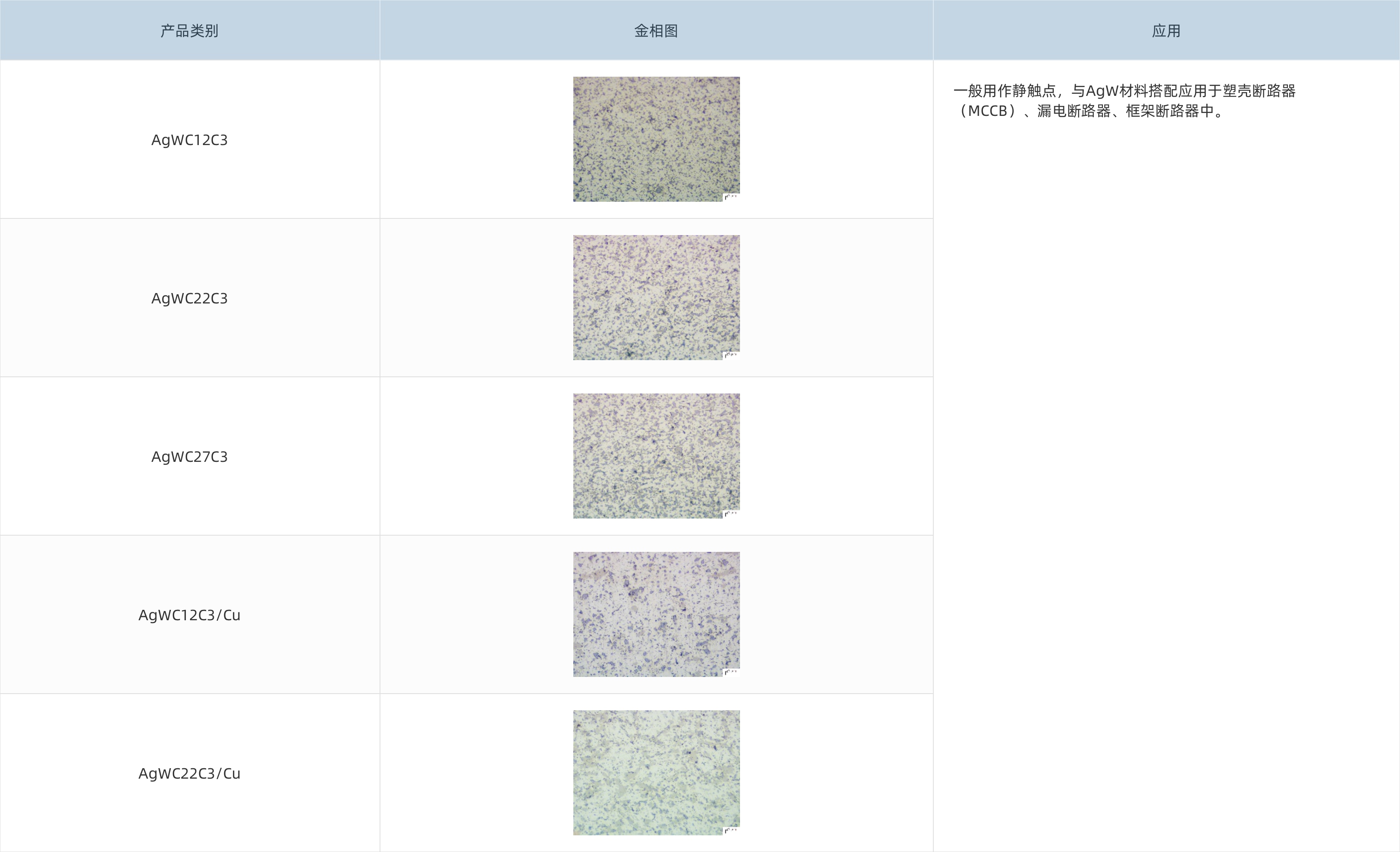 AgWCC觸點(diǎn)采用粉末固相燒結(jié)法制備,產(chǎn)品銀含量較高,硬度較低,具有較低的接觸電阻,第三相即石墨的加入提高了材料的抗熔焊性和潤(rùn)滑性,一般用作靜觸點(diǎn)材料,與其他材料配對(duì)使用。